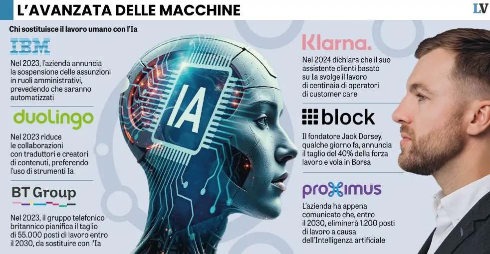 Il fondatore di Block non fa in tempo a eliminare il 40% dei dipendenti che la società di telecomunicazioni taglia 1.200 posti, da sostituire con l’Intelligenza artificiale. Giorgia Meloni: «Quando la politica capirà sarà troppo tardi».L’uomo zombie (sul divano con il reddito di cittadinanza sul conto corrente) era il sogno di Beppe Grillo. L’uomo senza coscienza, annullato dall’Intelligenza artificiale, è il costante incubo di papa Leone XIV. L’uomo sostituito dall’algoritmo è lo spunto più interessante dell’intervista del presidente del Consiglio, Giorgia Meloni, a Bloomberg.Continua a leggere