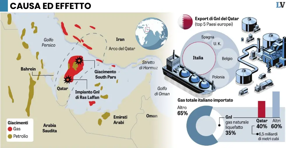 Dopo gli attacchi iraniani a Ras Laffan, Roma rischia di perdere il 40% del Gnl per cinque anni. Insieme a Belgio, Corea e Cina.L’esecutivo studia nuove mosse. Si va verso un cdm straordinario. Opposizioni patetiche: prima chiedono misure e poi le definiscono «elettorali».Lo speciale contiene due articoli.Continua a leggere