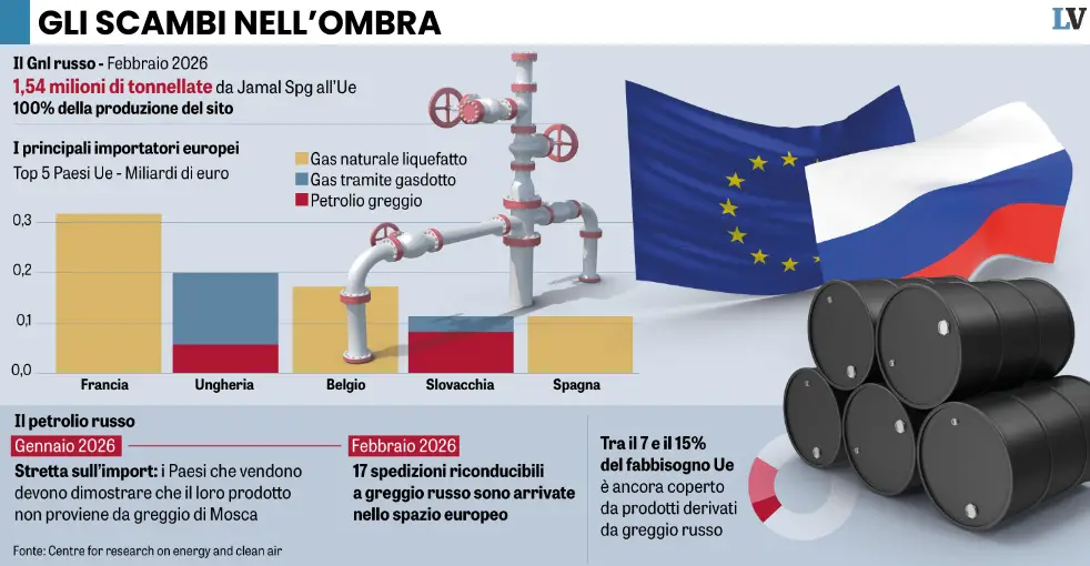 A febbraio, i Paesi Ue hanno comprato il 100% del gas liquido prodotto nella penisola Jamal. E nonostante la stretta, continua ad arrivare anche il greggio. Tanto vale agire allo scoperto e tamponare l’emergenza.Non abbiamo grosse alternative: o tappiamo le falle causate della crisi di Hormuz con le forniture russe, approfittando della sospensione delle sanzioni Usa sulle petroliere già in mare, o rischiamo il crollo dell’economia. In fondo, il passo da compiere sarebbe più formale che sostanziale: il Vecchio continente, infatti, continua a ricevere energia da Mosca. Nonostante i proclami dei dirigenti dell’Ue. Continua a leggere