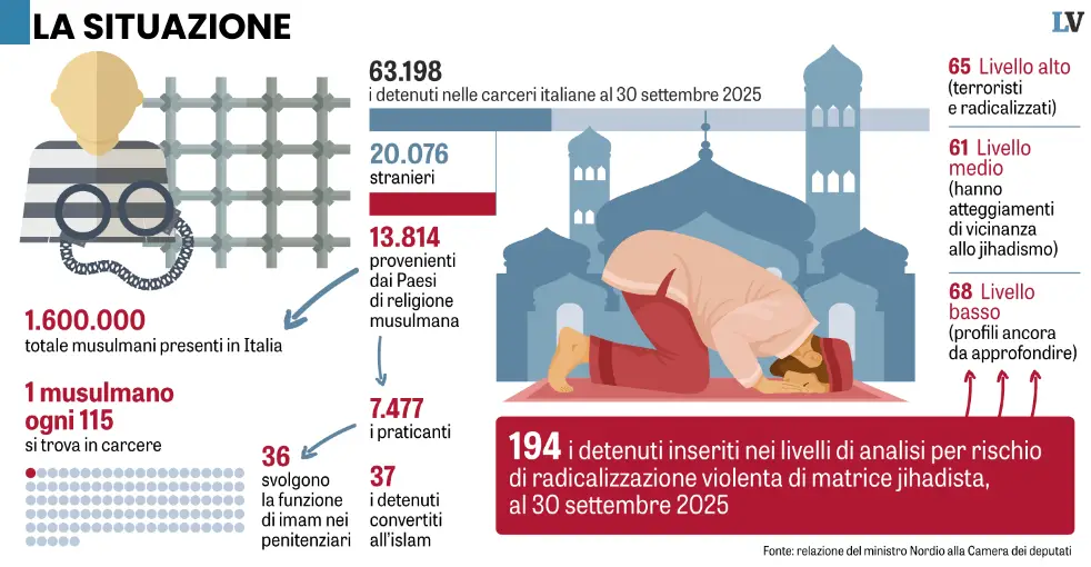 Un musulmano ogni 100 presenti in Italia è in cella. In totale ce ne sono 13.814, agli ordini di decine di predicatori che organizzano i momenti di preghiera nei penitenziari. Intanto 37 detenuti si sono convertiti ad Allah e 194 sono a rischio radicalizzazione violenta.Le carceri italiane scoppiano. In cella ci sarebbe infatti più del doppio dei detenuti consentiti dalla capienza degli istituti di pena. Nonostante amnistie, indulti e depenalizzazioni introdotte nel corso degli anni dal Parlamento, gli ultimi dati parlano di un sovraffollamento del 137 per cento e per questo l’Italia ha ricevuto plurime condanne dalla Corte europea dei diritti dell’uomo. Tuttavia, a fronte di cifre allarmanti sulla saturazione del sistema carcerario, ce ne sono altre che dovrebbero far riflettere e che, soprattutto, dovrebbero aiutare a capire un fenomeno. I numeri da cui partire sono quelli della popolazione reclusa in generale e quello dei detenuti stranieri.Continua a leggere