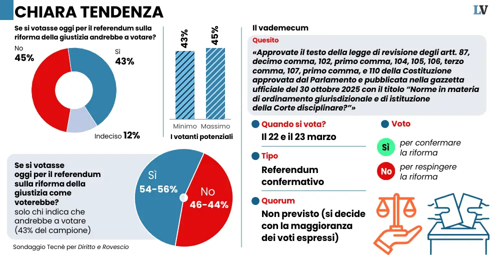 Per l’Istituto Tecnè i cittadini favorevoli alla riforma sono in netto vantaggio (54-56% contro 44-46%). Ghisleri conferma oltre 4 punti di distacco. Mentre Youtrend ribalta le tendenze giocando sulla partecipazione.«In questo mondo non c’è nulla di sicuro tranne la morte e le tasse», diceva Benjamin Franklin. Aggiungiamo: e la battaglia sui sondaggi in vista di una competizione elettorale. Manco a dirlo, ecco che il dibattito referendario ora si infiamma anche intorno alle previsioni dei sondaggisti, che «sondano», per l’appunto, l’umore degli italiani sulla riforma della Giustizia. Se fossimo in un Paese normale, la sintesi sarebbe: il Sì è in vantaggio ma la partita non è chiusa. Invece no: ora dobbiamo fare i conti anche con una nuova forma di sondaggio, quello a geometria variabile, che cambia la previsione finale a seconda dell’affluenza.Continua a leggere