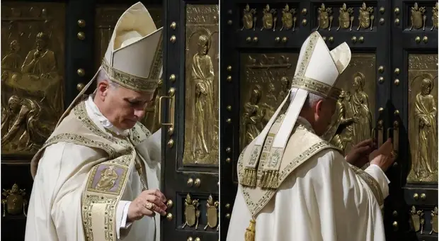 Papa Leone XIV parla di ricerca della giustizia e della pace, il coro della Sistina intona l'antico canto ?O clavis David? mentre si avvicina alla Porta Santa inginocchiandosi e...