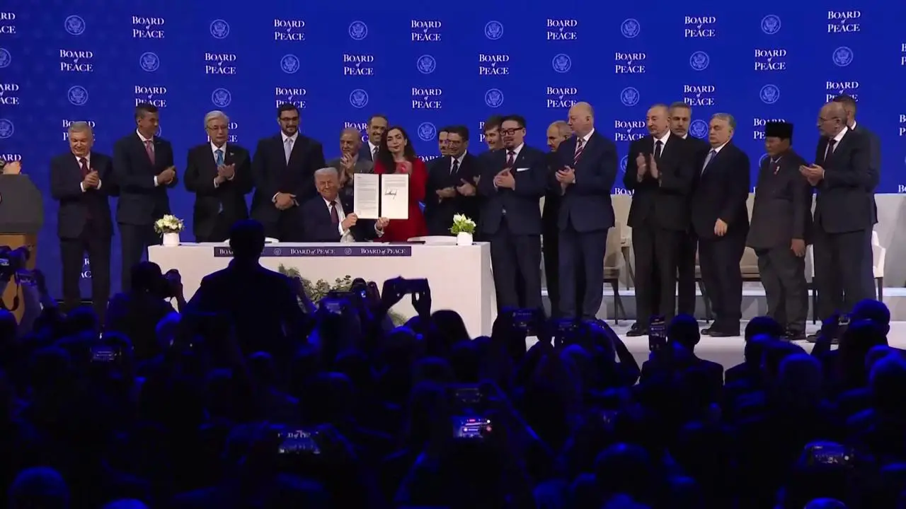 Trump firma il documento finale, circondato da tutti gli altri membri aderenti, stabilendo in modo formale il Board of Peace come organizzazione internazionale. I leader e i rappresentanti che ne fanno parte hanno firmato prima a turno con il presidente americano.