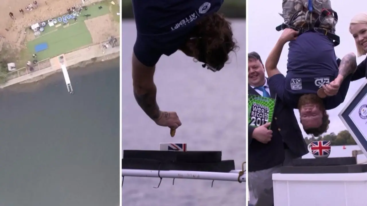 Un salto da Guinness e un record a testa in giù: l'inglese Simon Berry, 24 anni, si è lanciato con il bungee-jumping da 73 metri d'altezza ed è riuscito a inzuppare un biscotto al cioccolato in una tazza di te. Un'impresa definita da Libro dei Record come la più "inglese" di tutte