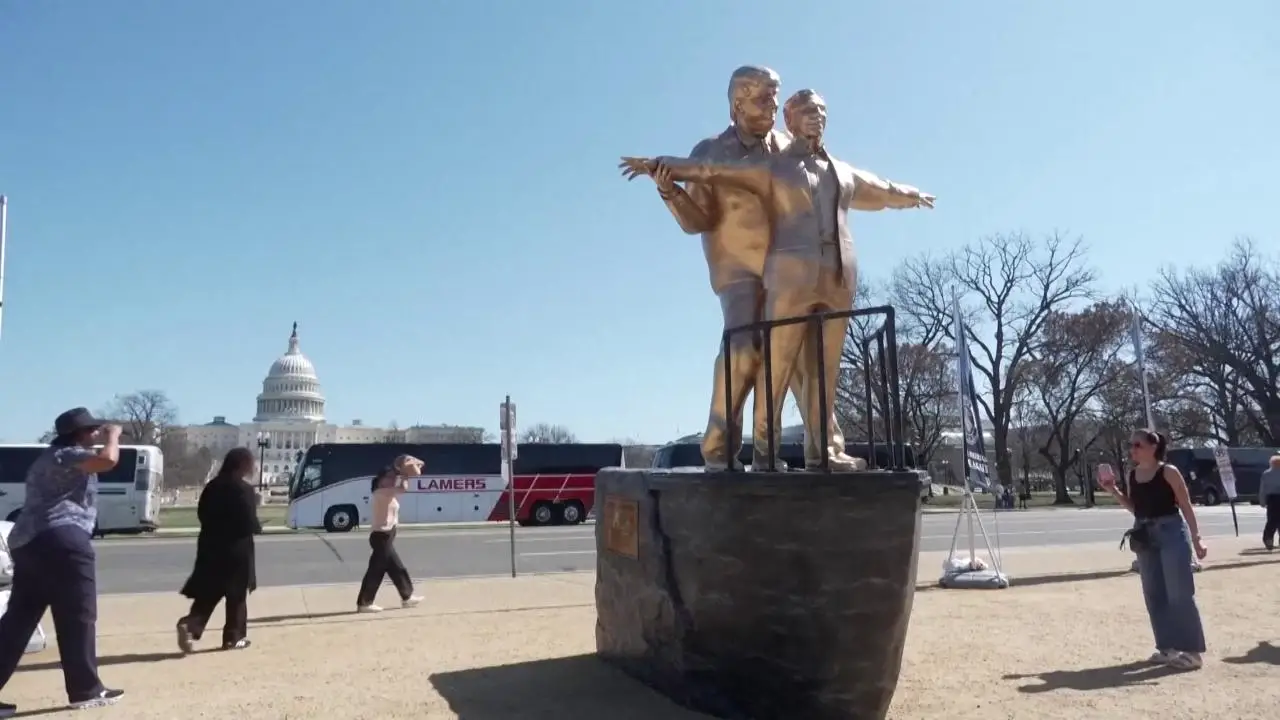 Davanti a Capitol Hill la statua che irride Trump ed Epstein, come DiCaprio e Winslet in Titanic