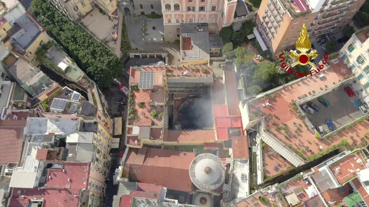 Nelle immagini, cosa resta del teatro Sannazaro dopo l'incendio sviluppatosi nella notte. Le riprese aeree realizzate dai vigili del fuoco utilizzando un drone restituiscono la vastità della devastazione.