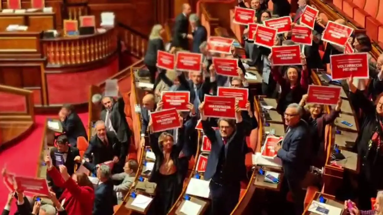 Legge di Bilancio al voto al Senato tra le proteste. I deputati del Pd e i colleghi delle opposizioni al termine delle dichiarazioni si sono alzati per tenere alti i loro cartelli rossi tutti con in evidenza la scritta "Voltafaccia Meloni". E poi, sotto. in grafica vari voltafaccia che si trovano in questa Finanziaria: "Promettevano abolizione accise, aumentano tasse sul carburante", "Promettevano abolizione Fornero, aumentano l'età pensionabile", "Promettevano investimenti in sanità, tagliano le risorse", "Promettevano diminuzione tasse, è record pressione fiscale". Leggi