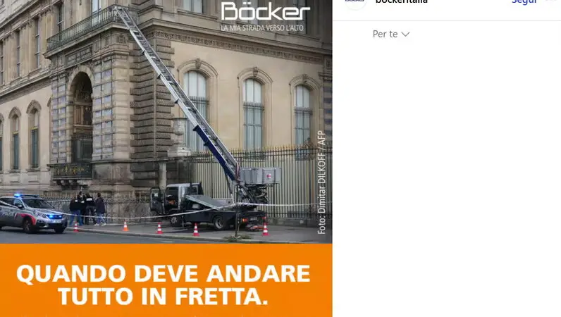La tedesca Böcker ha riconosciuto il montacarichi usato nel furto al museo e ha trasformato l’episodio in una trovata di marketing: un post ironico sui social per pubblicizzare la macchina usata dai ladri