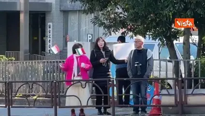 Cartello di auguri e bandierine italiane per la premier Meloni dai fan giapponesi fuori dal Kantei
