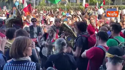 Corteo pro Gaza a Roma, musicisti suonano in strada con bandiere Palestina e kefiah