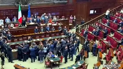 Roma, 21 apr. (askanews) - Protesta delle opposizioni alla Camera che hanno occupato i banchi del governo e lo spazio antistante dell'emiciclo. La capog…