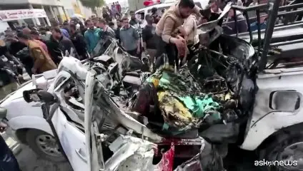 Gaza, 14 apr. (askanews) - Alcuni palestinesi ispezionano un veicolo della polizia distrutto in un raid aereo israeliano che ha ucciso quattro persone, …