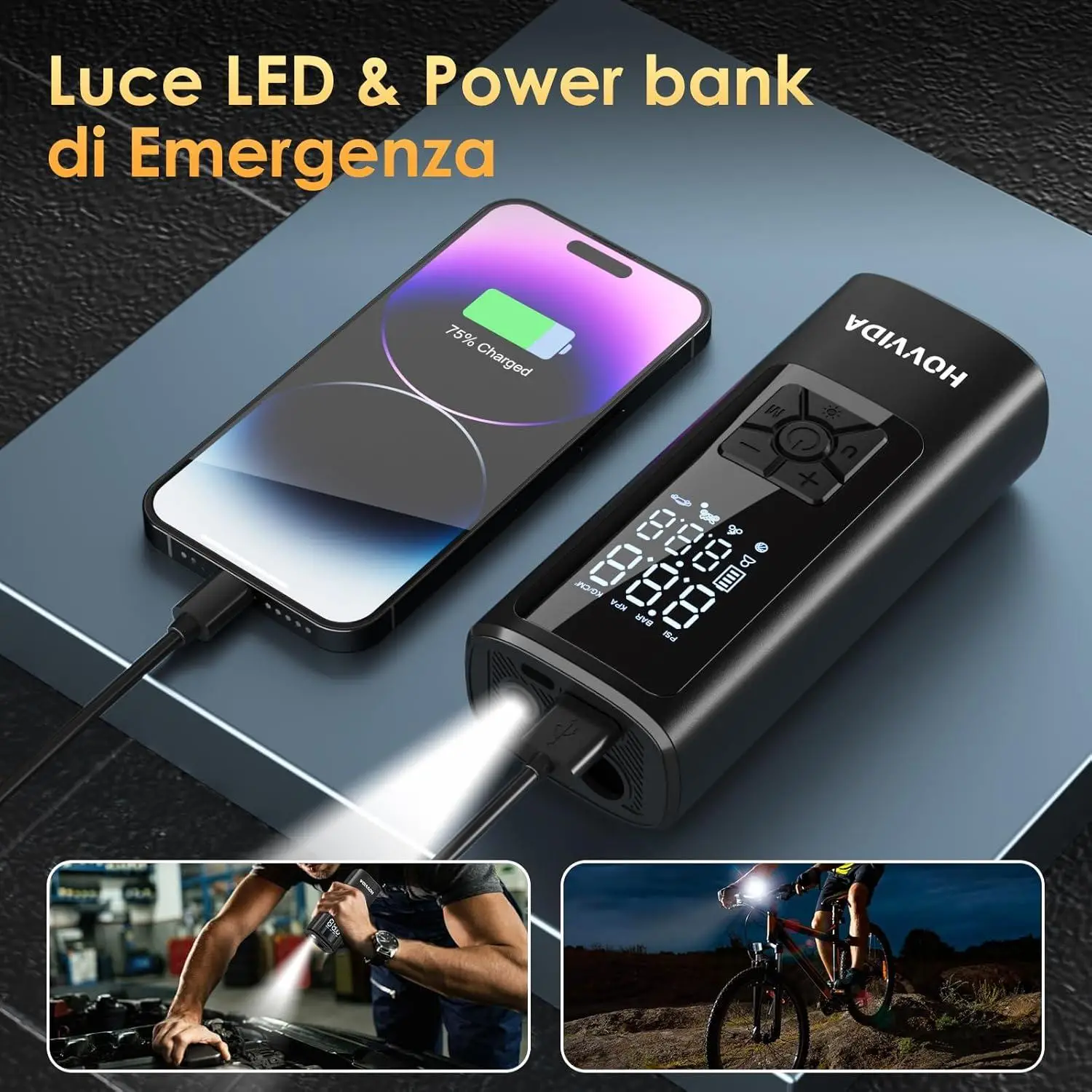 HOVVIDA AM21J2, il compressore portatile con inflazione rapida, batteria 5200 mAh, LED e power bank. Ideale per auto, bici e emergenze, oggi in super sconto.