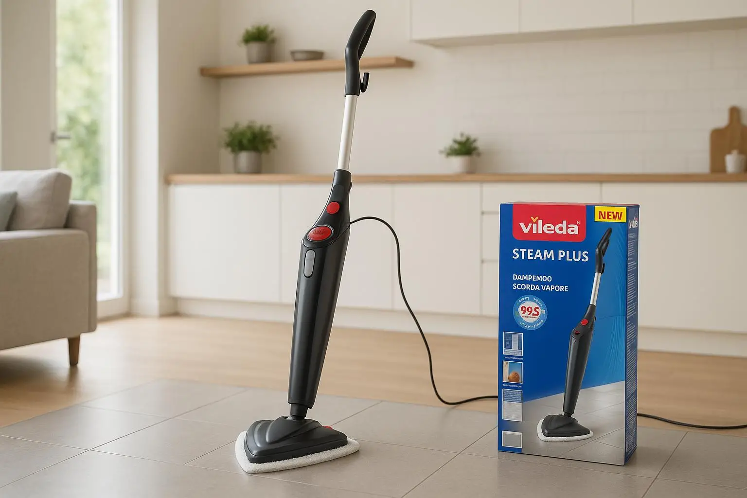 Vileda Steam PLUS in offerta a 69,99 euro: scopa a vapore che elimina il 99,9% di batteri e virus senza detergenti, pronta in 15 secondi.