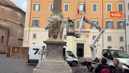 Operazioni in corso per riparare la zanna dell'elefante della Minerva a Roma