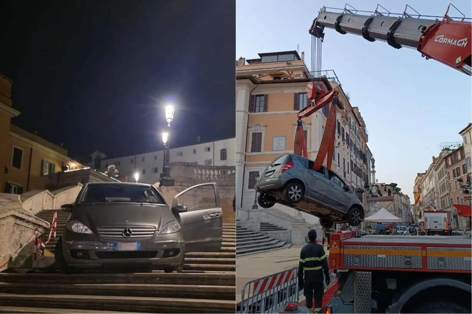 Roma, in auto sulla scalinata di Trinità dei Monti. Rimossa con un’enorme gru