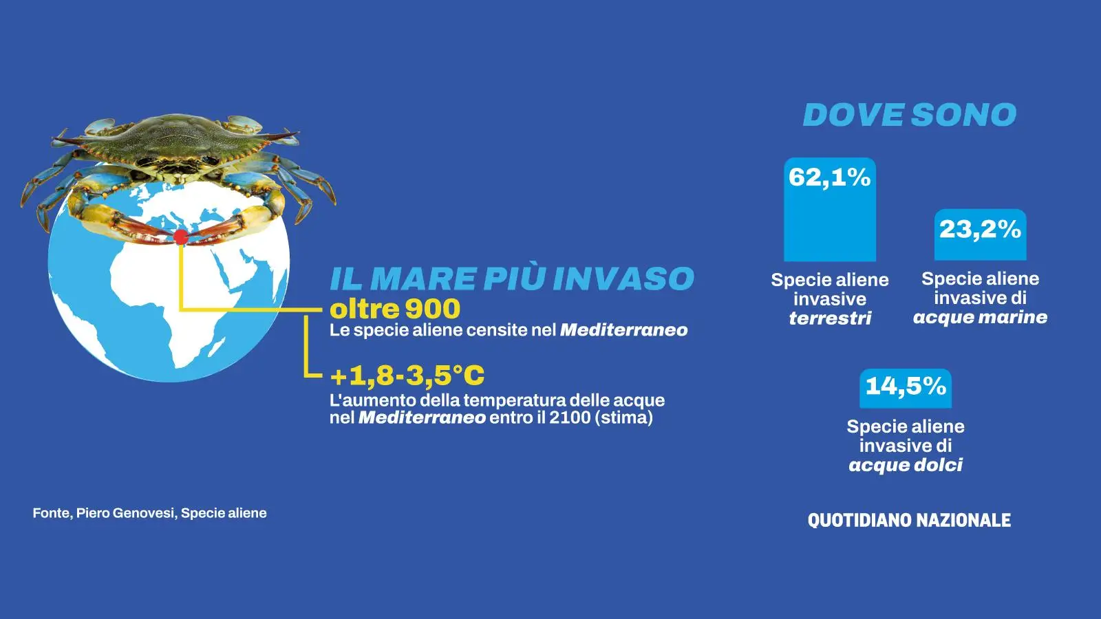 Dal granchio blu alla formica di fuoco alle zanzare: l’analisi di Piero Genovesi (Ispra), nella cabina di regia mondiale degli scienziati che studiano il fenomeno. Sono 3.500 quelle dannose a livello mondiale. “L’ultima stima valuta in 10,3 trilioni di dollari americani i costi tra 1970 e 2020. L’unico strumento efficace è la prevenzione”