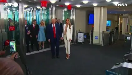 Dopo un istante di perplessita', il presidente sale con la First Lady Melania