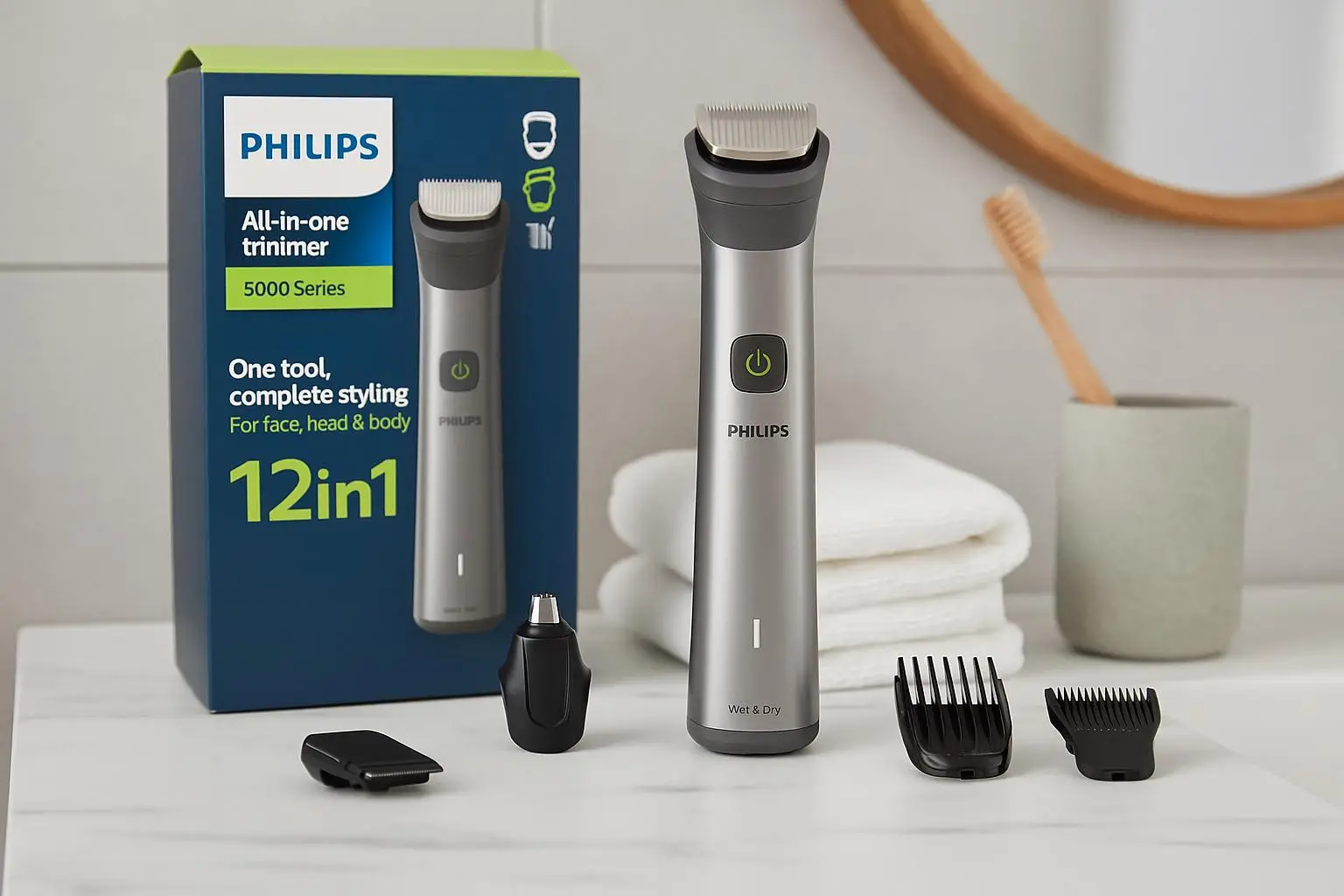 Acquista il Philips Series 5000 All-in-One, rifinitore con 12 accessori e tecnologia avanzata, ora disponibile a un prezzo scontato di 39,99 €.