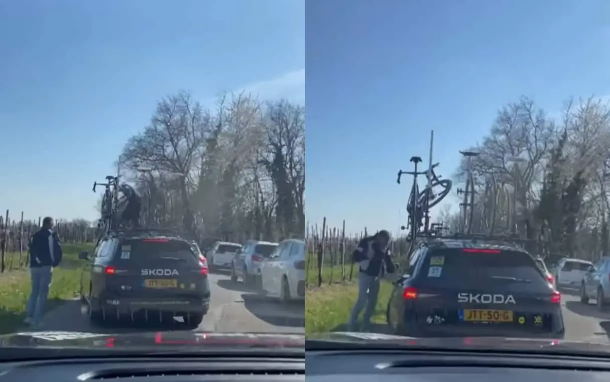 Coppi e Bartali, due uomini assaltano l'ammiraglia del team Visma