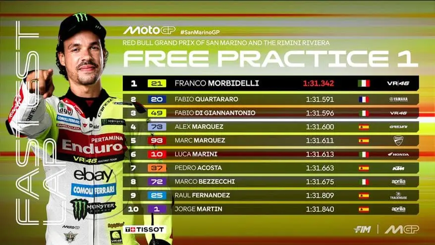 Morbidelli chiude le prove libere di Misano col miglior tempo in 1:31.342. Alle sue spalle Quartararo, 3° Di Giannantonio; seguono poi i fratelli Marquez con Alex davanti a Marc. 11° tempo invece per Bagnaia. Debutto anche per la Yamaha col motore V4: Augusto Fernandez ha chiuso in 21^ posizione. La MotoGP tornerà in pista alle 15 per le Pre-qualifiche, LIVE su Sky Sport e in streaming su NOW TUTTE LE FOTO DELLA YAMAHA V4