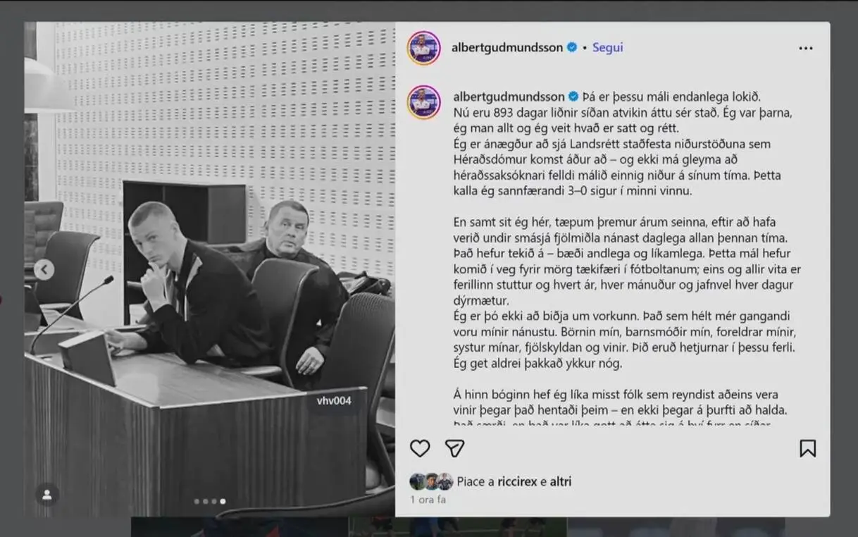 Leggi su Sky Sport l'articolo Gudmundsson, si sfoga sui social dopo l'assoluzione: 'Processo mi ha provato'