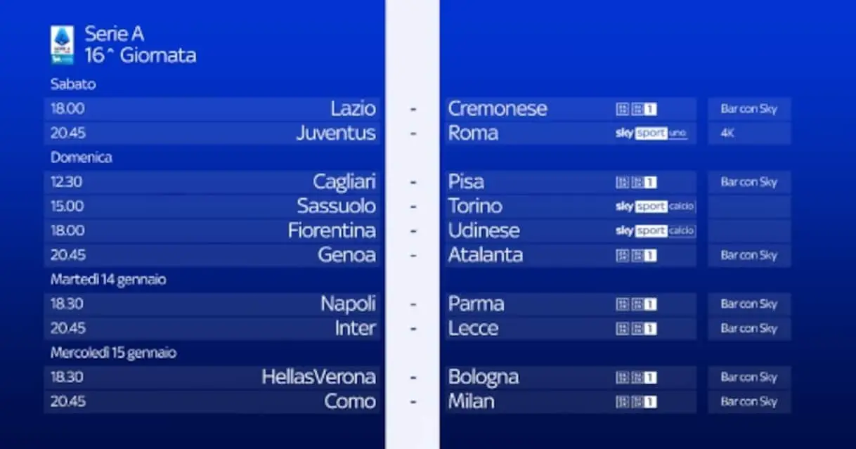 Il calendario della 16^ giornata di Serie A