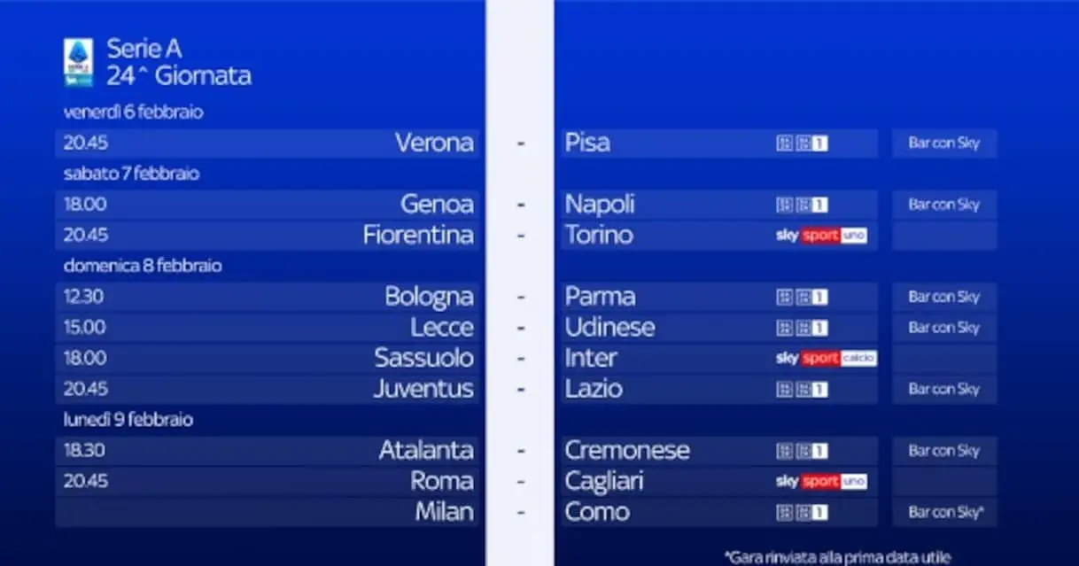 Il ventiquattresimo turno di Serie A della stagione si gioca da venerdì 6 a lunedì 9 febbraio. Le 3 partite in diretta su Sky e in streaming su NOW …