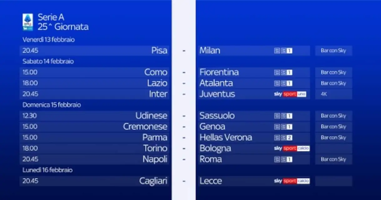 Il venticinquesimo turno di Serie A della stagione si gioca da venerdì 13 a lunedì 16 febbraio. Le 3 partite in diretta su Sky e in streaming su NOW …