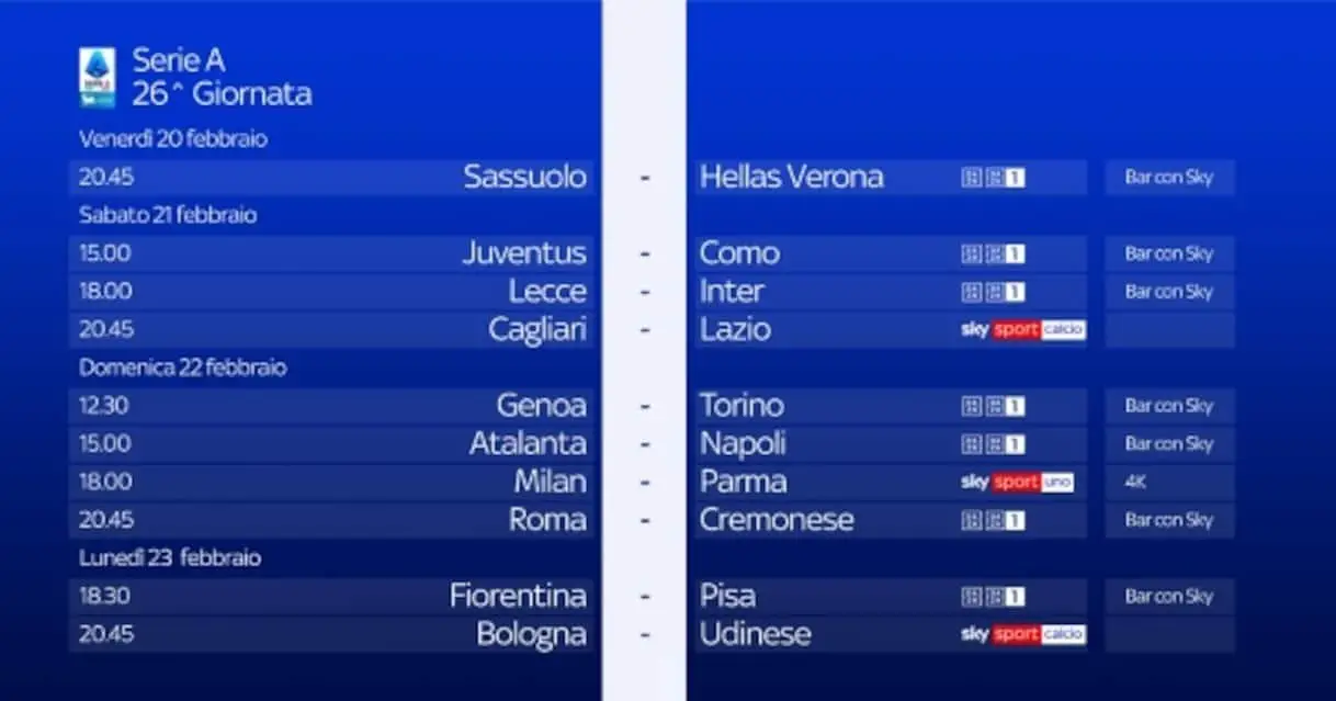 Il ventiseiesimo turno di Serie A della stagione si gioca da venerdì 20 a lunedì 23 febbraio. Le 3 partite in diretta su Sky e in streaming su NOW …