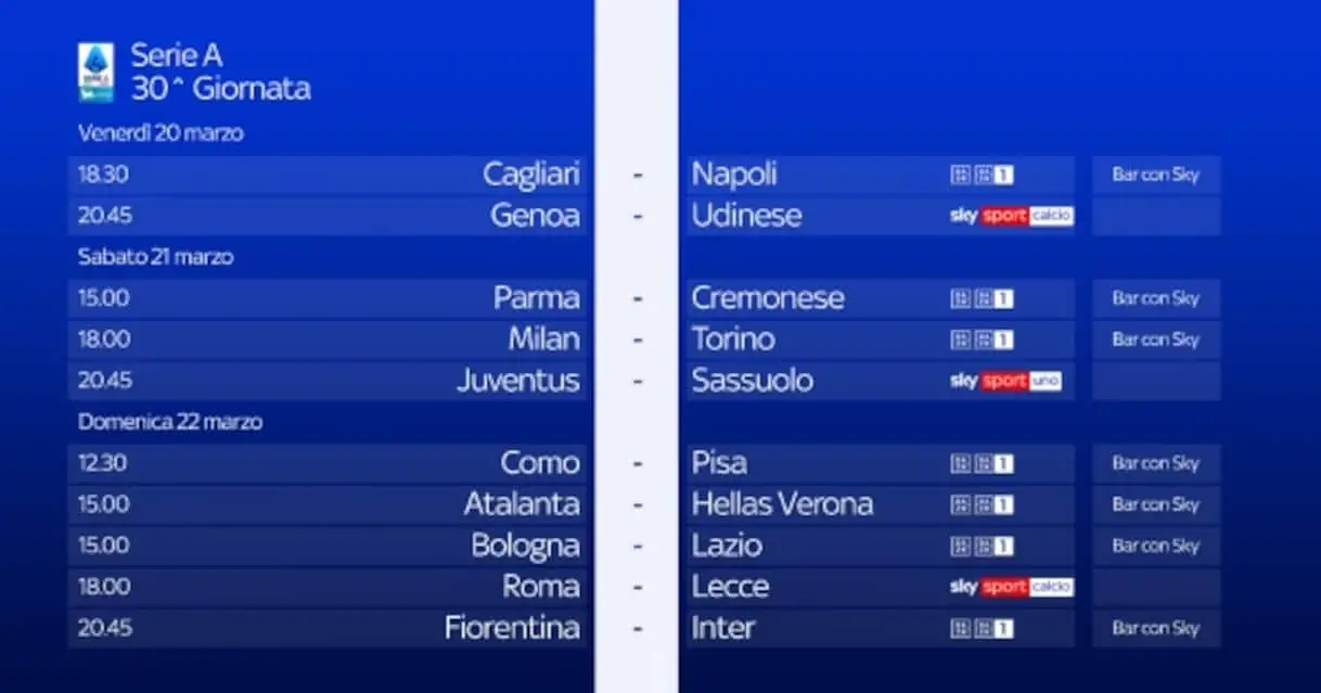 Il trentesimo turno di Serie A della stagione si gioca da venerdì 20 a domenica 22 marzo. Le 3 partite in diretta su Sky e in streaming su NOW saranno: …
