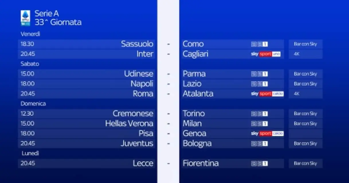 Il calendario della 32^ giornata di Serie A