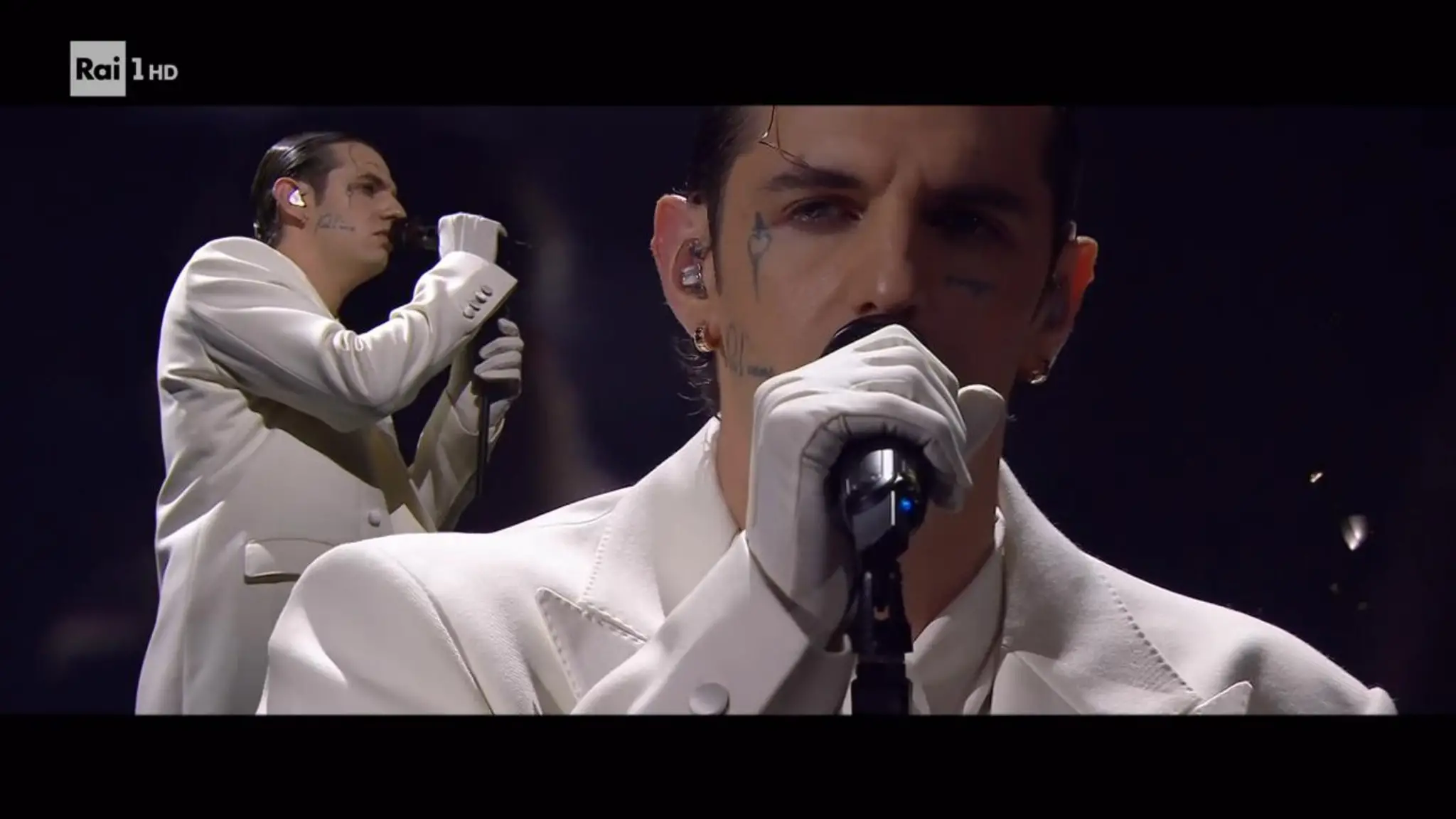 Atmosfera densa e toccante in bianco e nero all'Ariston. Il soprano Valentina Gargano e un imponente coro di 20 elementi per accompagnare l'omaggio dell'artista alle giovani vittime del rogo di Capodanno in Svizzera. Pubblico in piedi