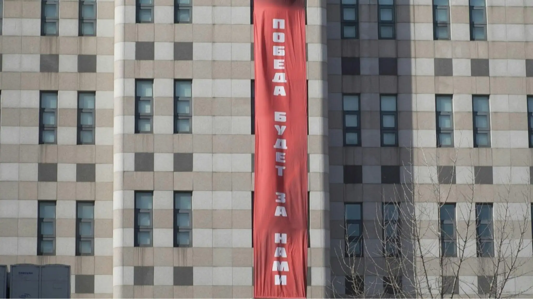 Lo striscione è comparso sull'ambasciata alla vigilia dell’anniversario dell’invasione dell’Ucraina. Il governo sudcoreano ha chiesto la rimozione