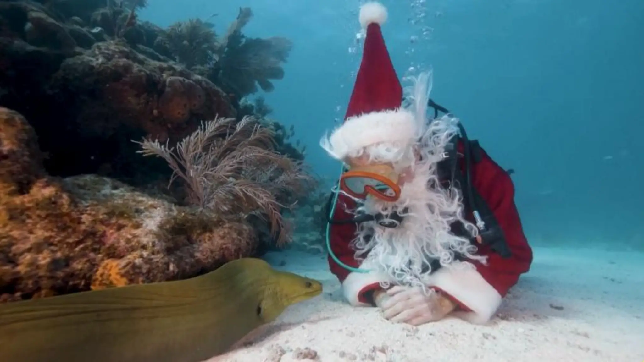 Babbo Natale nel mare della Florida tra murene e squali, circondato da elfi e sirene "natalizie"