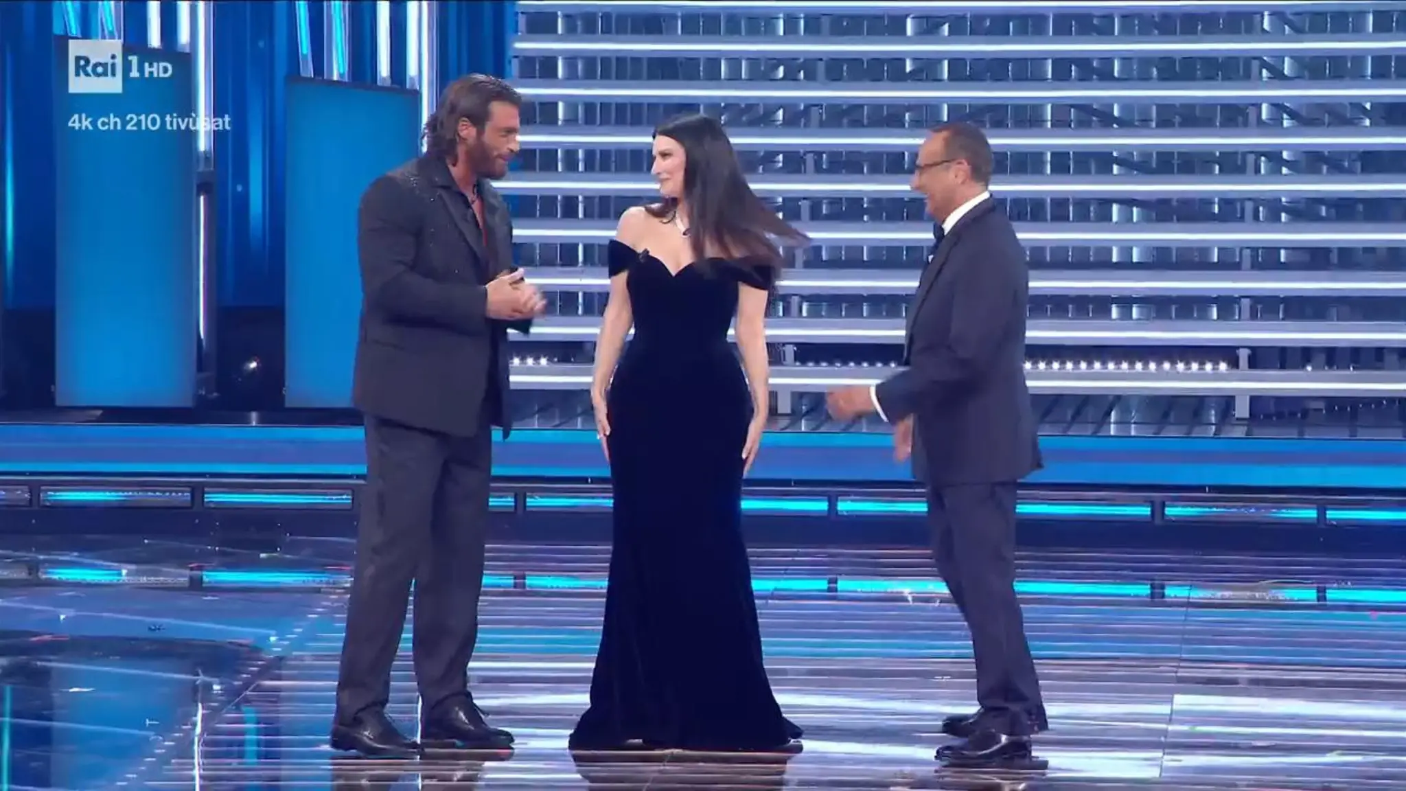 Scherzano sull'abbronzatura dell'attore e modello turco, "L'unica cosa che avete in comune", dice la Pausini rivolgendosi a Carlo Conti