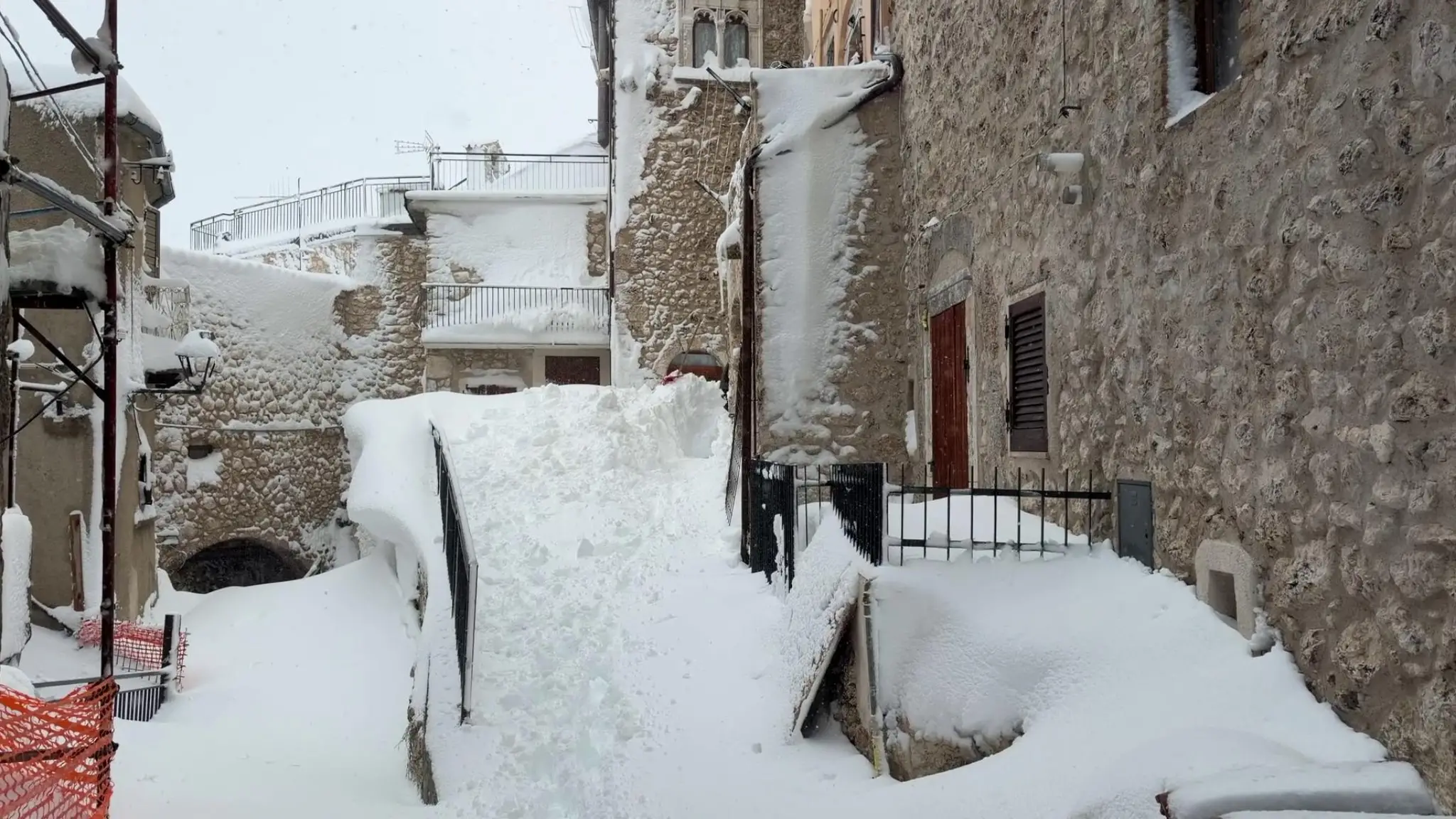 I volontari spalano la neve dai portoni e dai vialetti del centro storico del borgo in provincia dell'Aquila