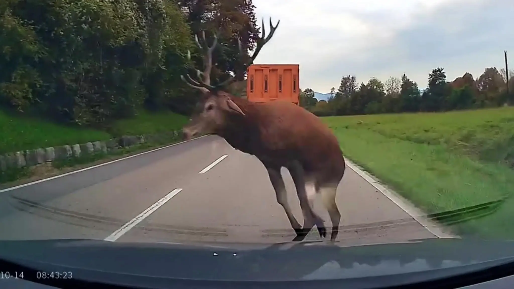 Cervo attraversa la strada con un balzo e sfiora il parabrezza di un'auto: impatto evitato