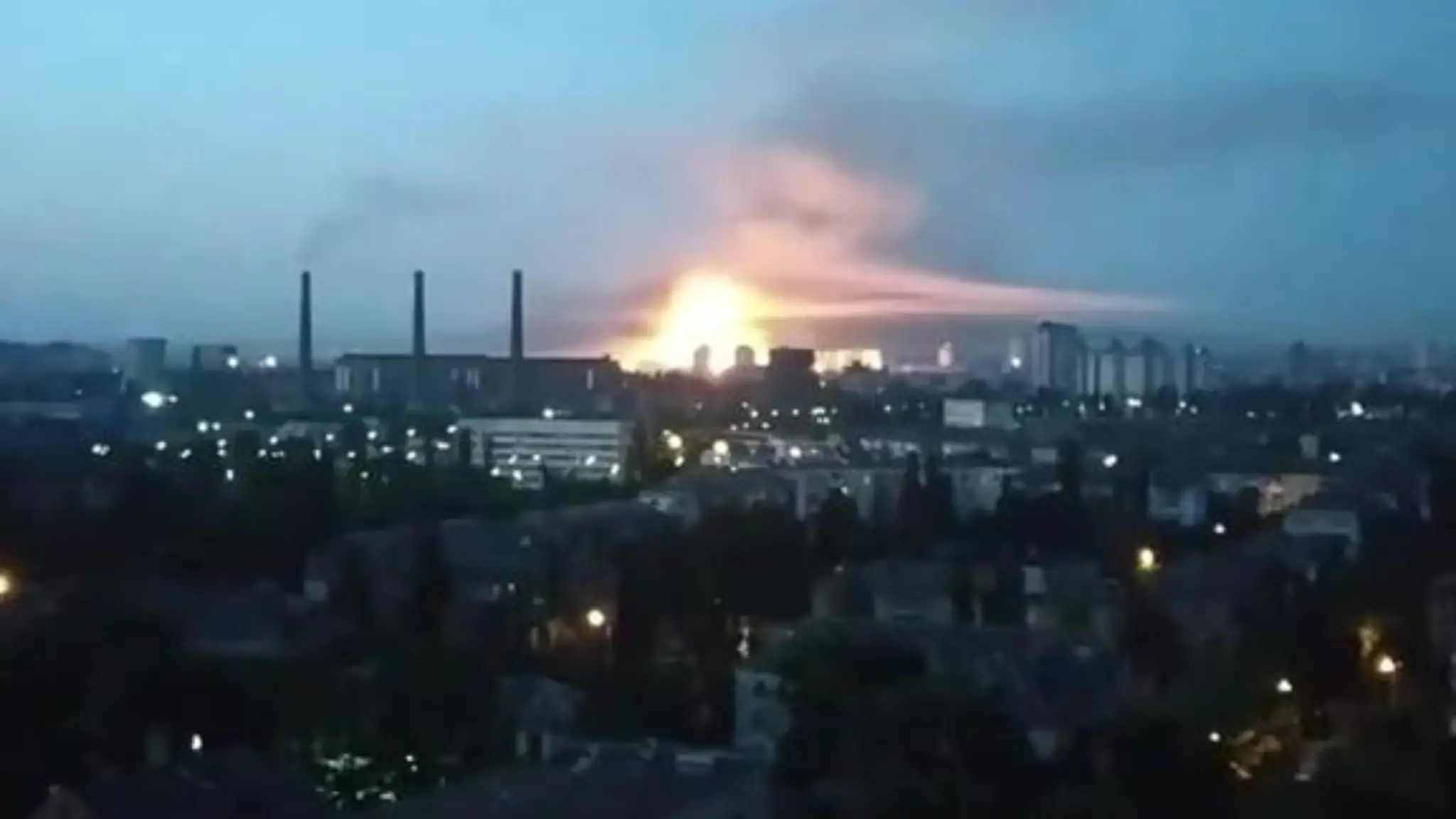 Un grande bagliore visibile da molto lontano mostra un raid missilistico russo nella notte