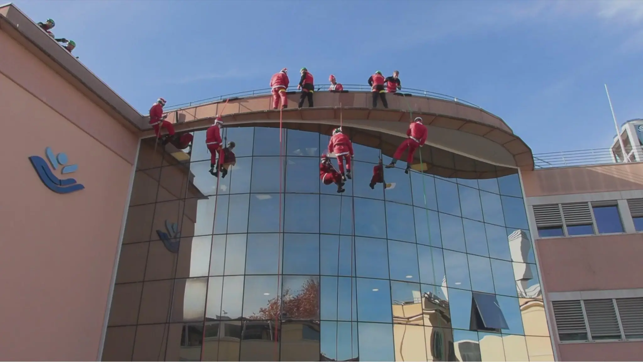 Gli uomini e le donne del soccorso alpino, travestiti da Babbo Natale, si calano con le corde tra le finestre dell'ospedale Bambino Gesù per salutare e portare regali ai bambini ricoverati. L'iniziativa della Protezione civile del soccorso alpino