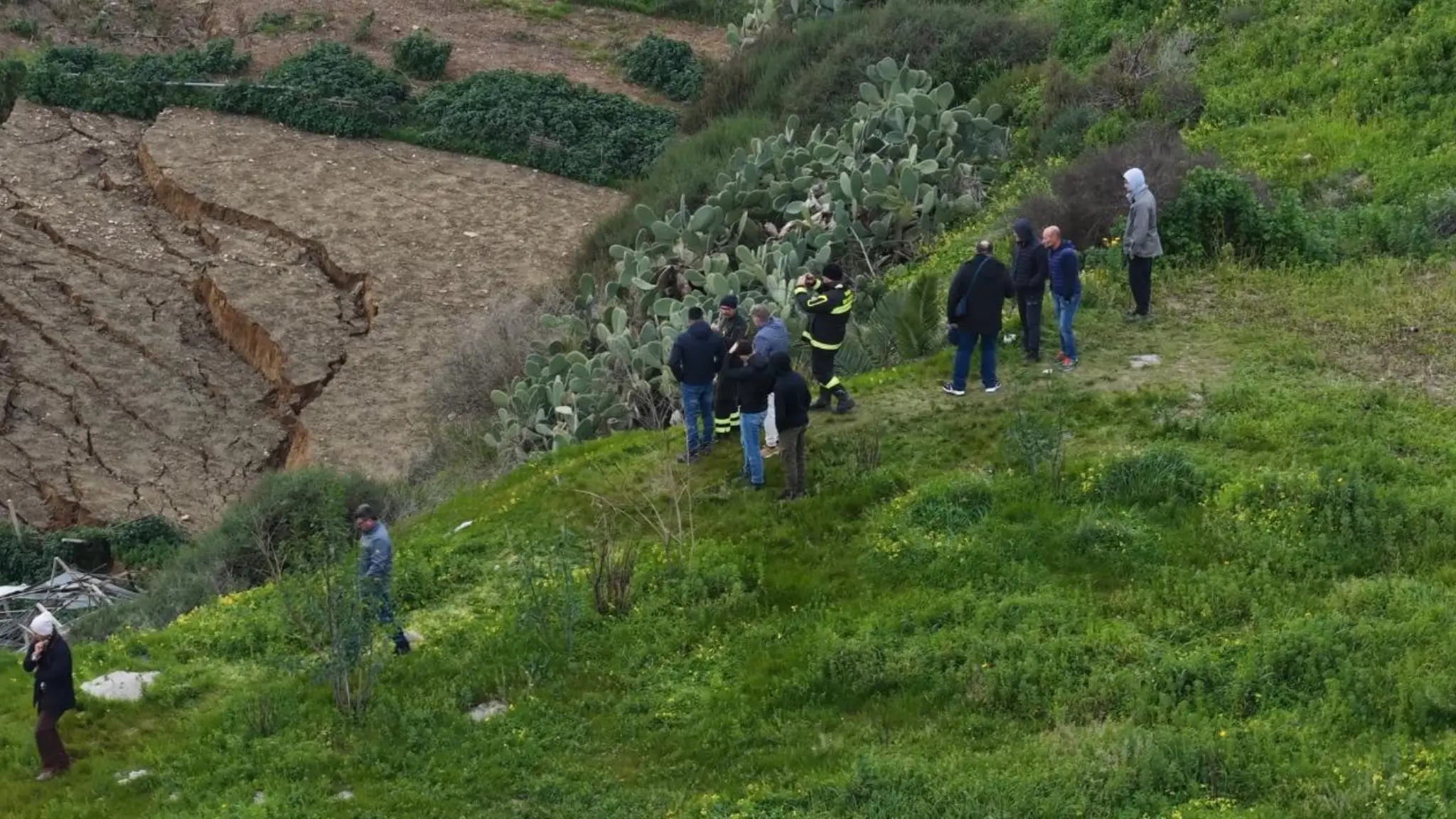 Drone mostra i Vigili sul bordo dell'abisso a Niscemi, i controlli vicino alla frana