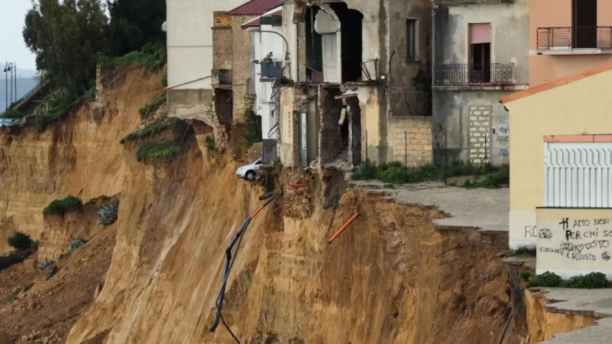 Le immagini di un drone mentre riprendono la frana che avanza e che sta minacciando il centro abitato di Niscemi, in provincia di Caltanissetta. Visibile anche il crollo dal vivo di una nuova porzione di terreno e di parte di una casa