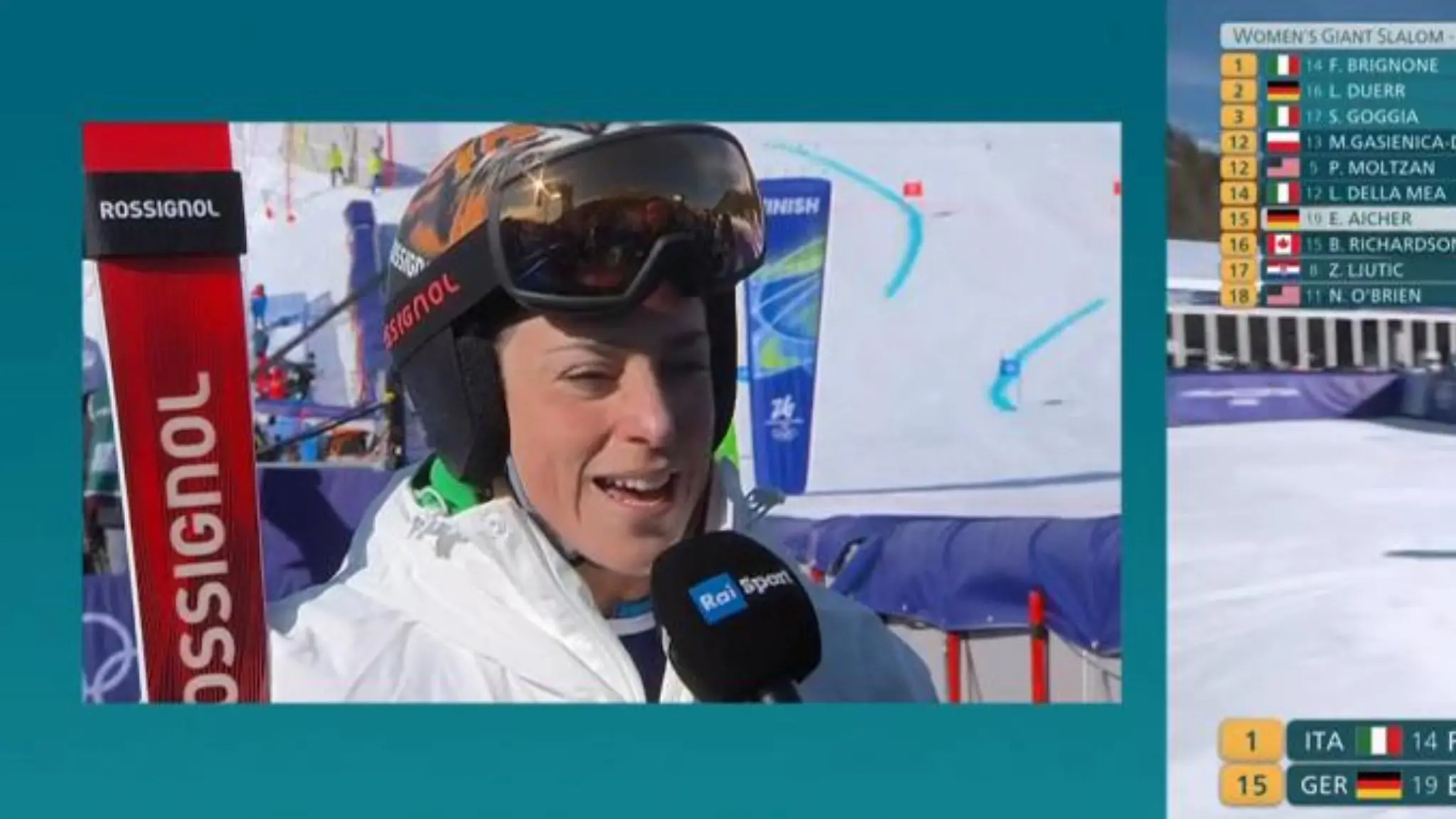 Nell'intervista in zona mista Federica Brignone commenta i risultati della grande performance nella prima manche dello slalom gigante dei Giochi olimpici di Milano Cortina 2026 sulla pista 'Olympia delle Tofane' a Cortina d'Ampezzo