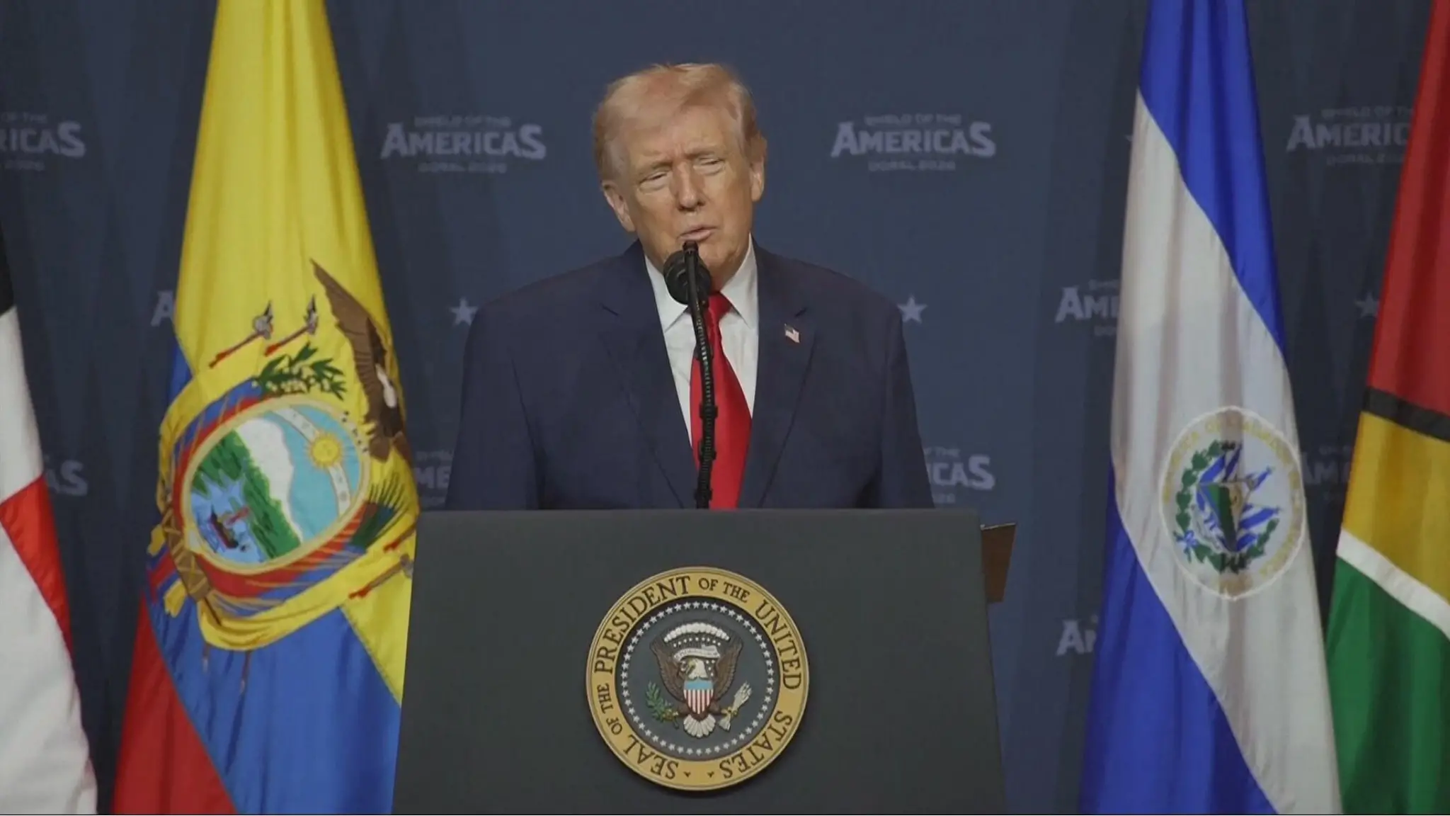 Il presidente Usa al vertice dello Shield of the Americas, in Florida, dopo aver minacciato di allargare i raid a nuovi bersagli