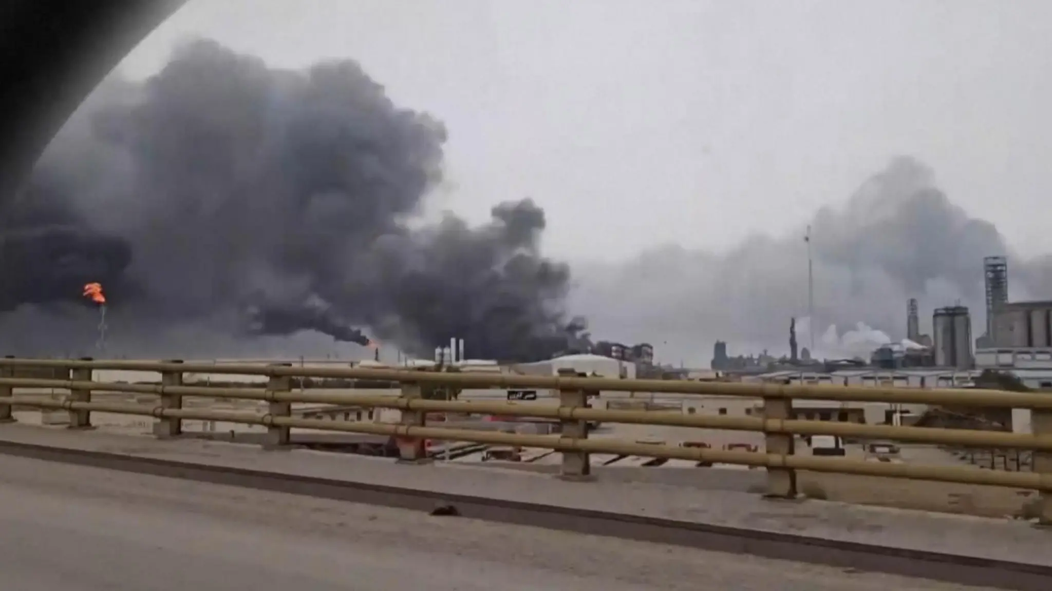 L'area petrolchimica di Mahshahr bombardata, il fumo e la nube tossica si alzano dallo stabilimento