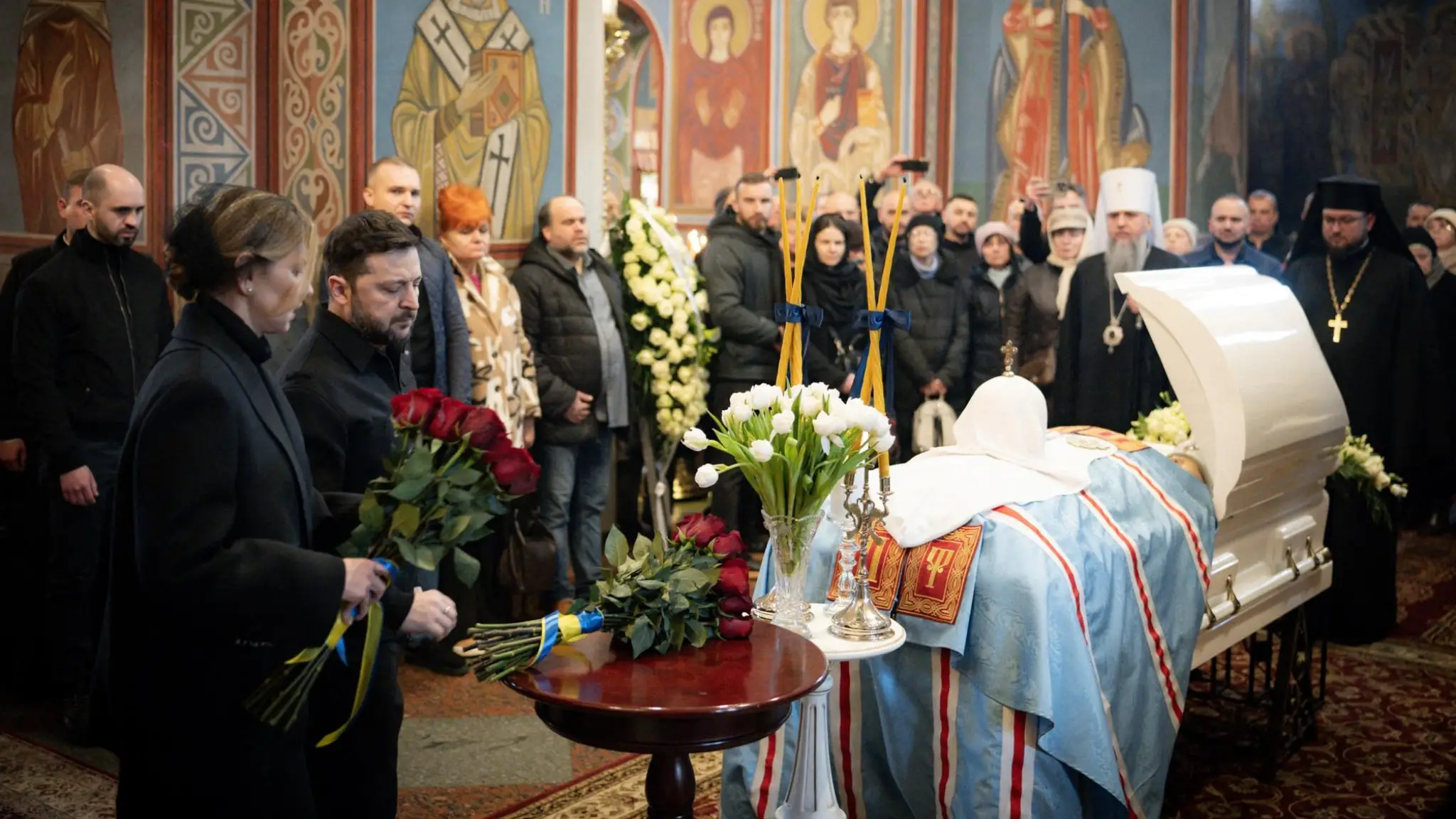 L'omaggio di Volodomyr Zelensky sulla bara del patriarca Filaret, morto a 97 anni