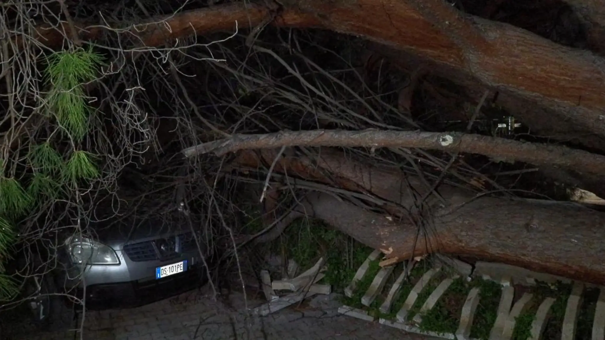 Un albero di grosse dimensioni è caduto nella serata di giovedì 12 febbraio all'interno di un cortile condominiale, abbattendosi sulla cancellata e colpendo due auto e uno scooter