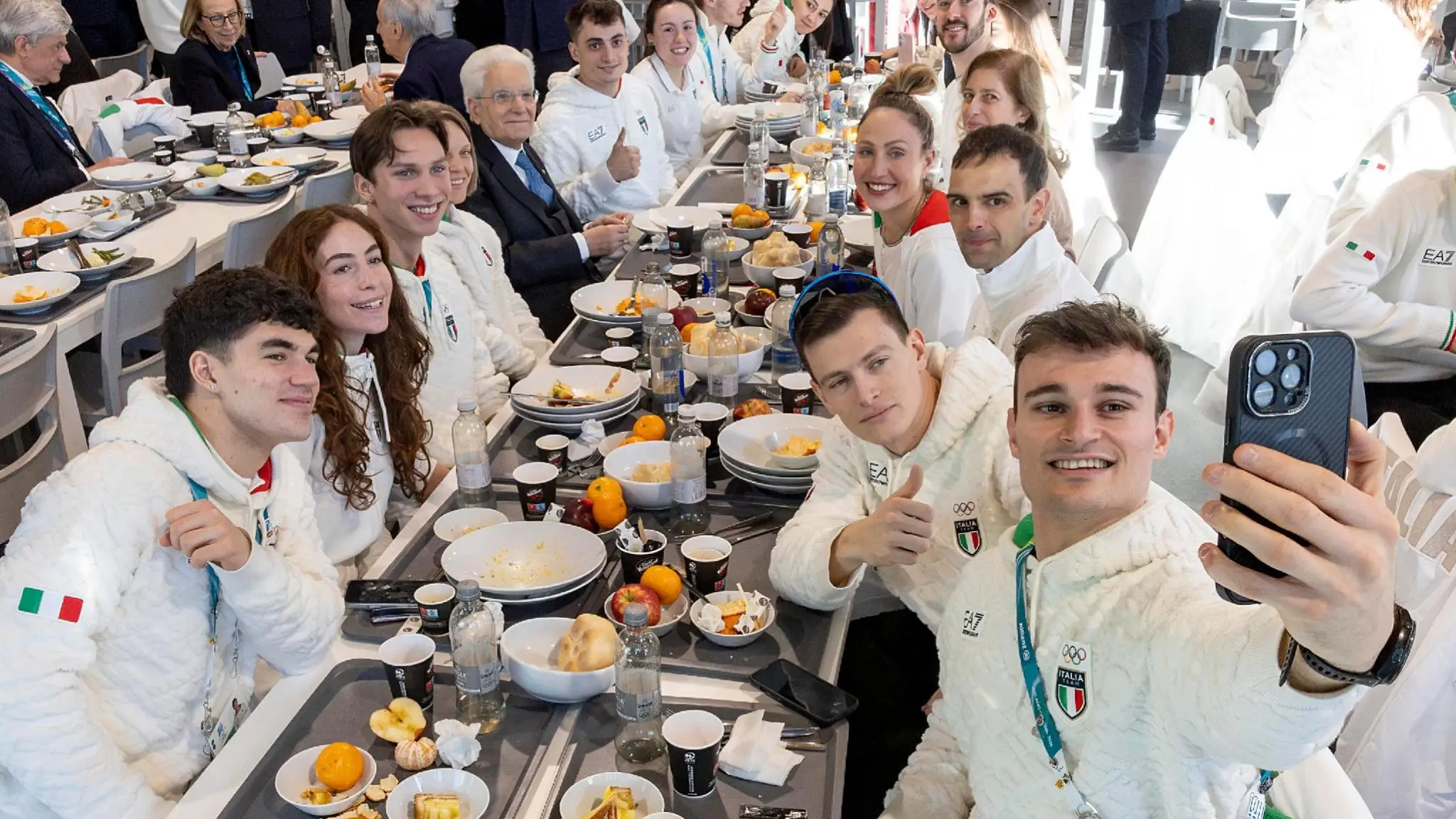 Mattarella a pranzo con gli atleti italiani: tra video, selfie e lasagne alla zucca