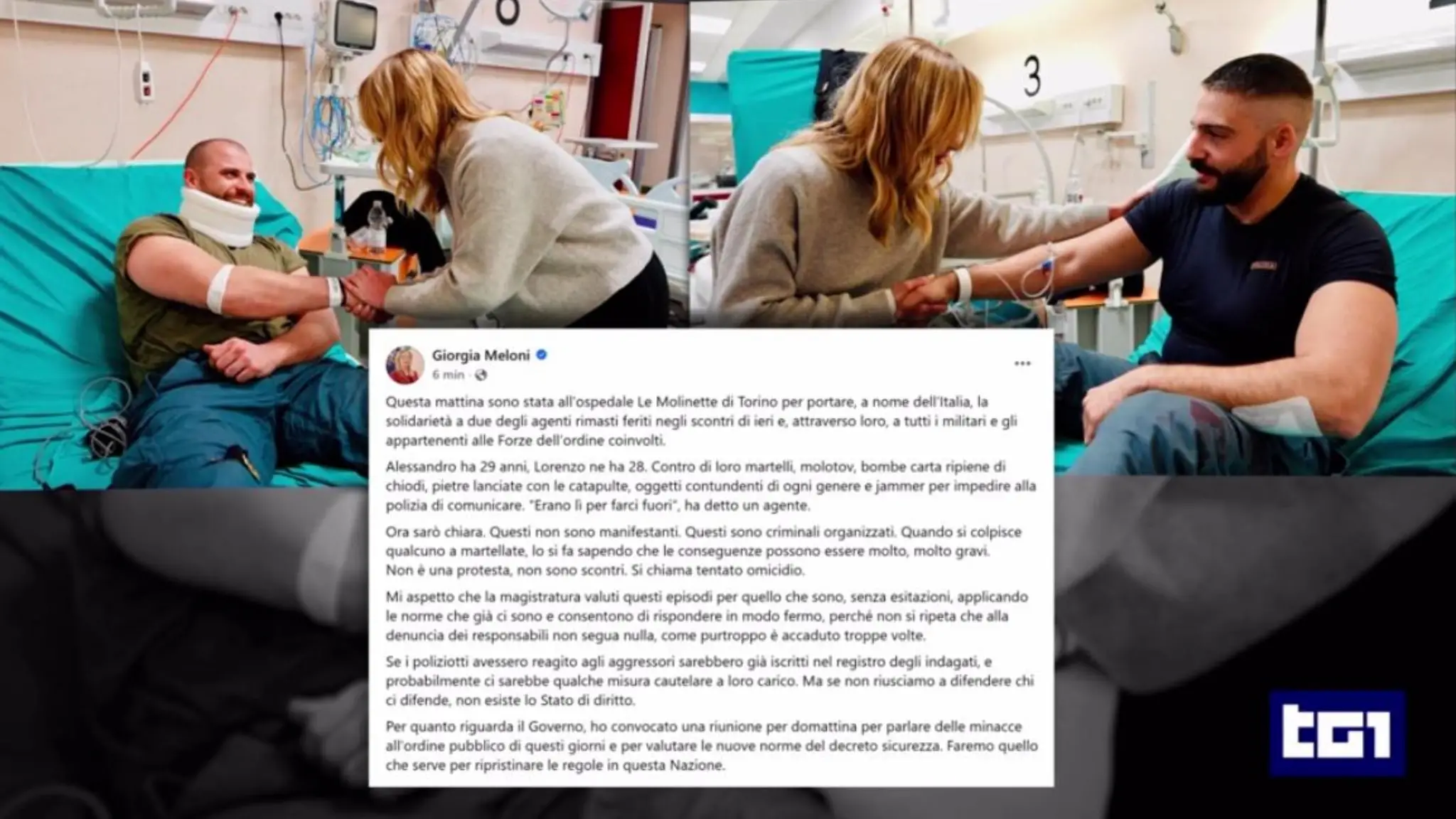 Giorgia Meloni incontra Alessandro Calista il poliziotto vittima del pestaggio di ieri e gli agenti ricoverati alle Molinette di Torino. Questi sono criminali organizzati, scrive sui social. Domani mattina riunione per le minacce all'ordine pubblico