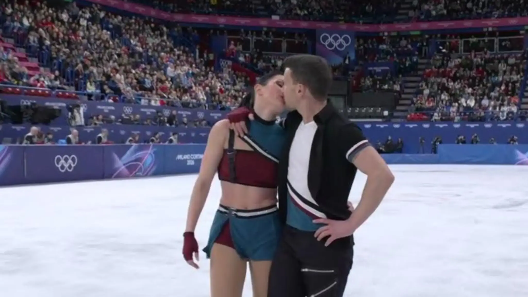 Milano Cortina 2026, pattinaggio di figura: il bacio della coppia azzurra alla fine della gara